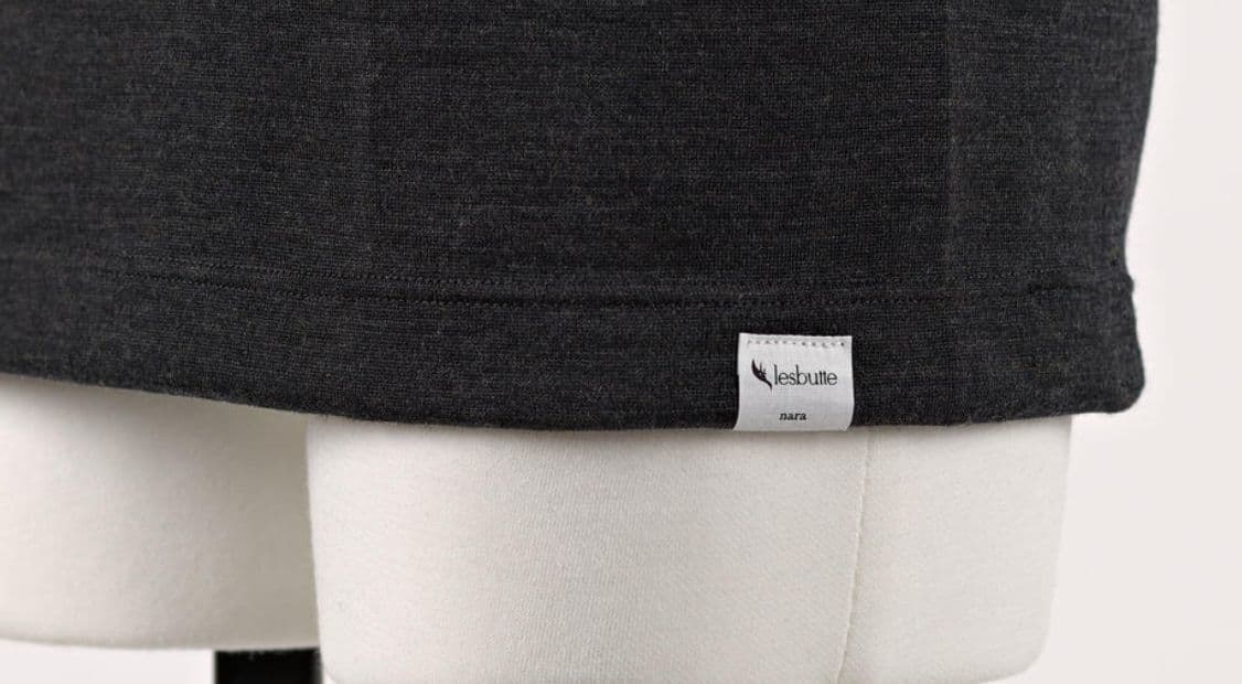 綿100%の薄くて柔らかい素材を使用した洗濯ネームは、素肌に触れにくい裾部分に縫い付けました。