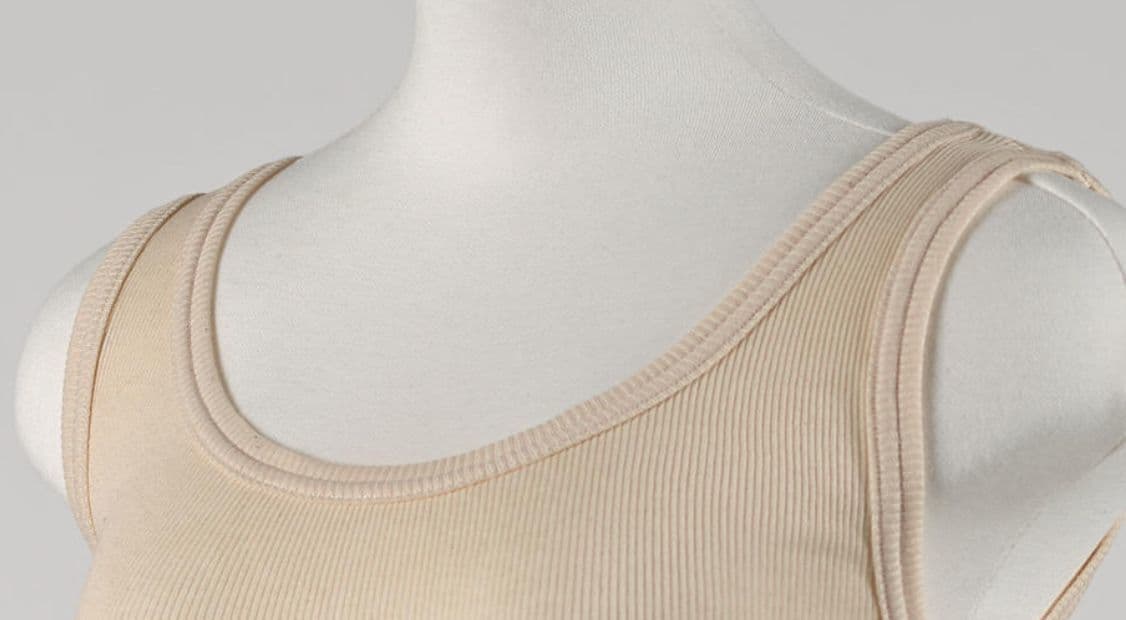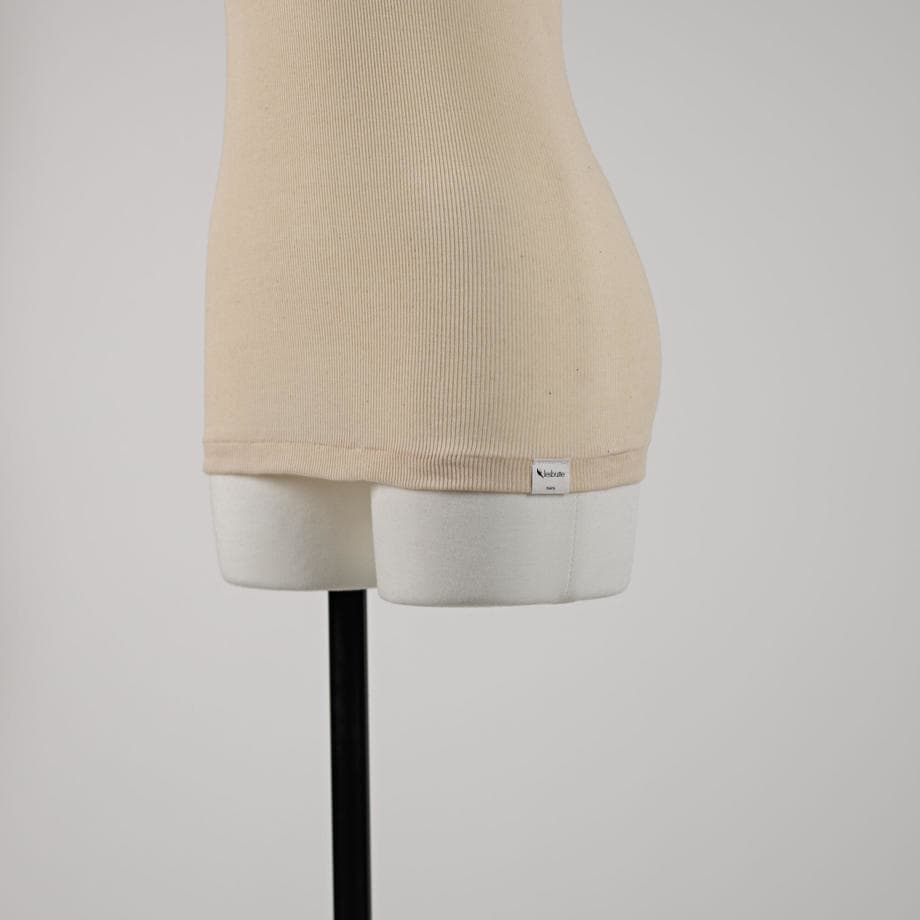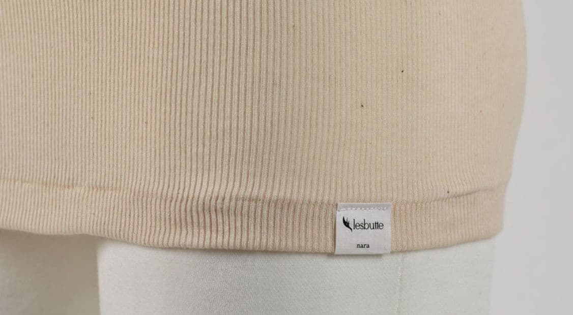 綿100%の薄くて柔らかい素材を使用した洗濯ネームは、素肌に触れにくい裾部分に縫い付けました。